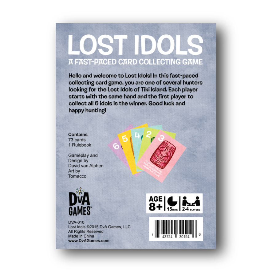 Hello and welcome to Lost Idols! In this fast-paced collecting card game, you are one of several hunters looking for the Lost Idols of Tiki Island. Each player starts with the same hand and the first player to collect all6 idols is the winner. Good luck and happy hunting!